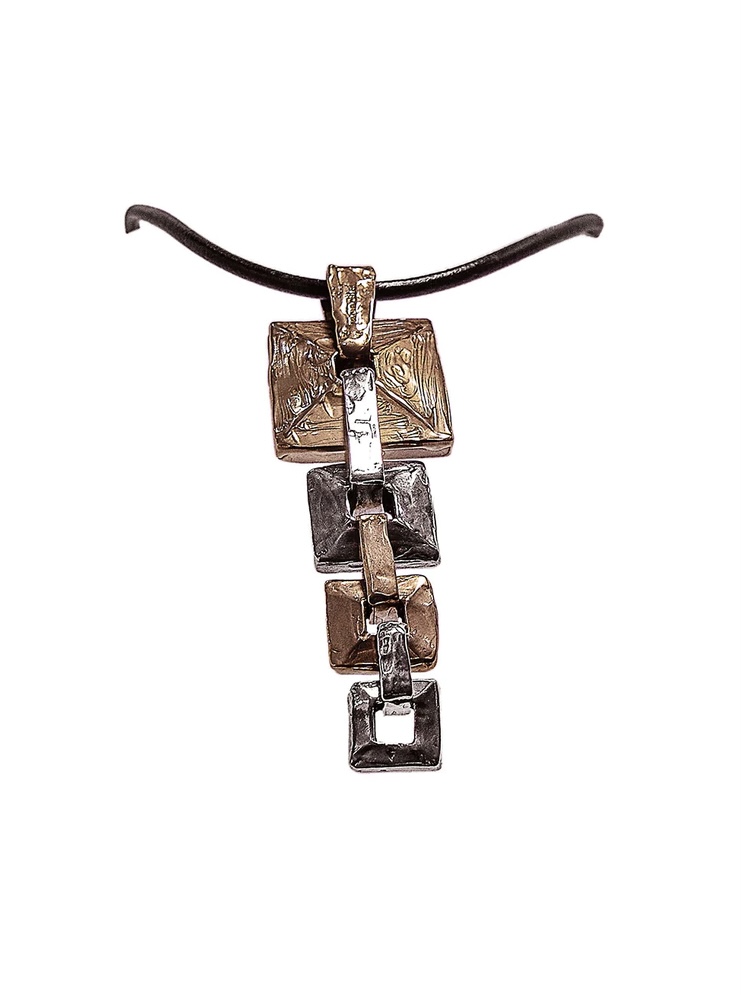 Collezione Quadri in argento 925 e bronzo.Pendente formato da quattro elementi quadrati in alternanza di colore e grandezza.Lunghezza ciondolo cm.11,5 Laccio in cuoio con chiusura artigianale T-bar,lunghezza 43cm.Consegna entro 3gg.Spedizione gratuita.