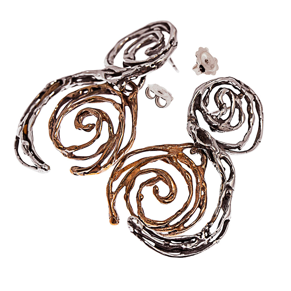 Particolari orecchini della linea Mandile modello spirale con elementi snodati capaci di caratterizzare il viso in maniera originale ed intrigante.In argento 925 e bronzo. Consegna entro 10 giorni lavorativi.Spedizione gratuita.