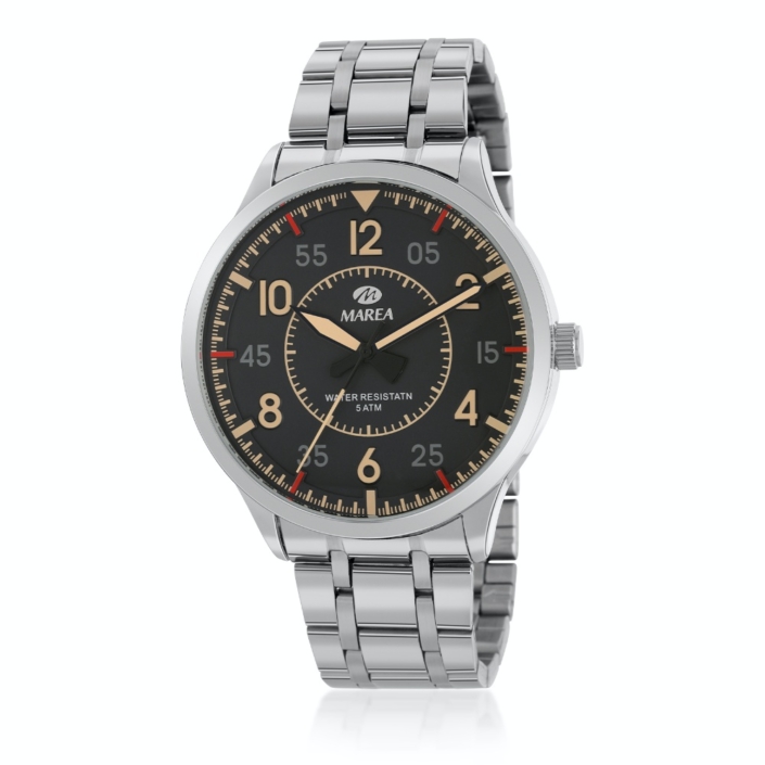 Orologio da uomo in acciaio. Cassa in metallo diametro 44 mm. Bracciale in acciaio. Quadrante grigio scuro con dettagli e lancette beige e rossi.Resistente all’acqua 50metr. Consegna entro 3gg lavorativi.