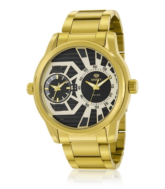 Orologio da uomo dorato. Cassa in metallo dorato di 48 mm di diametro. Bracciale in acciaio dorato. Quadrante nero con dettagli in oro. Movimento giapponese dual time. Resistente all’acqua 50m. Consegna entro 3gg lavorativi. Spedizione gratuita.