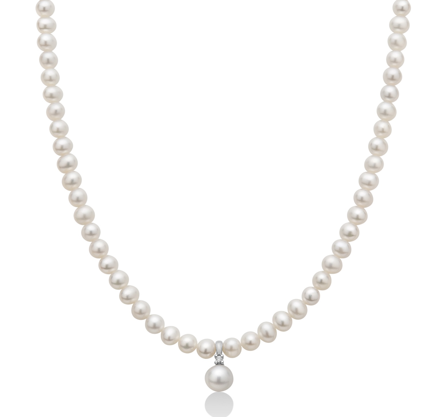 Collier di perle Miluna costituito da un filo di perle bianche del diametro di mm.5 5,5 con un pendente centrale in oro bianco 18kt costituito da una perla del diametro di mm.7,5-8 ed un diamante del peso di kt 0,02 Col.G SI. Lunghezza 41cm.Consegna entro 3gg Spedizione gratuita.