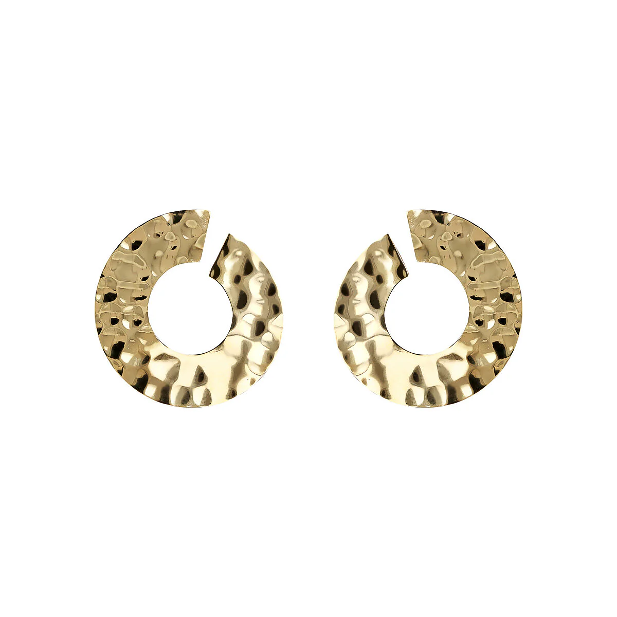 Orecchini pendenti ad anello montati su base Golden, placcata oro giallo 18kt, dalla superficie martellata e design semi-aperto. Chiusura a perno e farfalla.Consegna entro 3gg.Spedizione gratuita