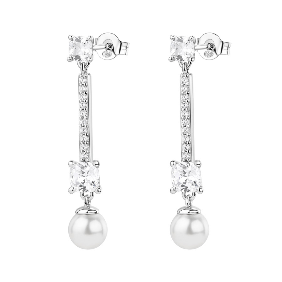 Orecchini pendenti in argento rodiato 925‰ con perle di conchiglia e cubic zirconia.