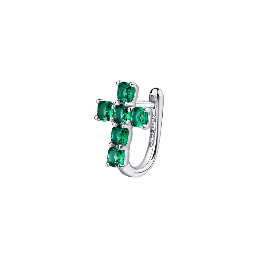 Orecchino singolo a lobo in argento rodiato 925‰ a forma di croce con cushion cubic zirconia colore emerald.