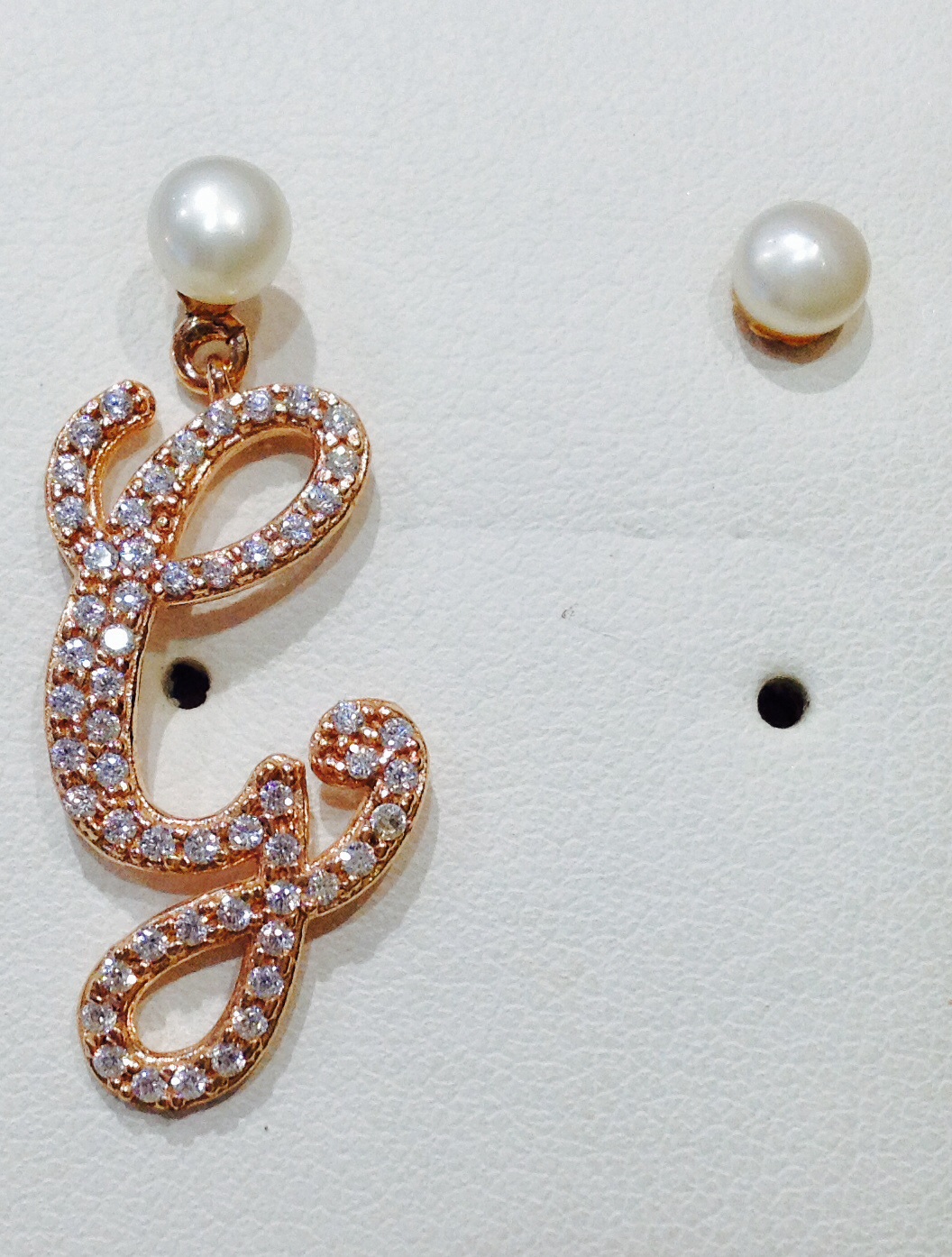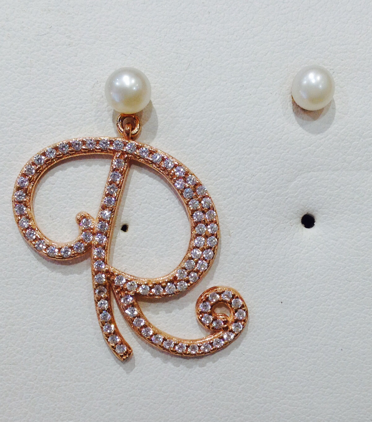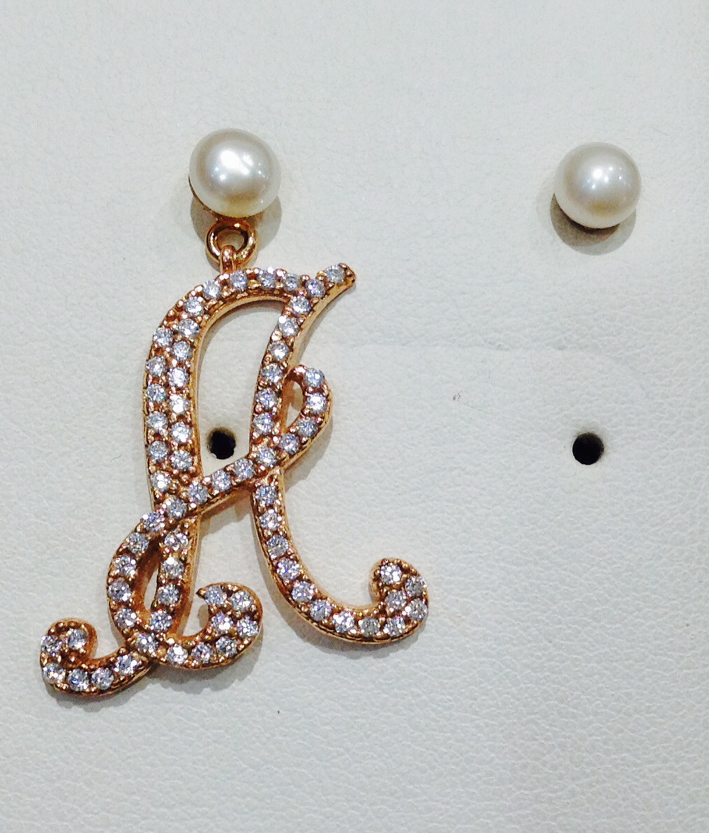 Orecchini con iniziale in argento rosè con perle originali e zirconi.