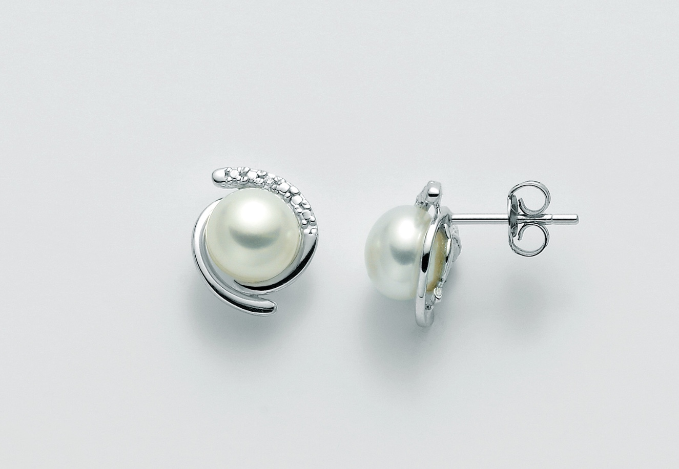 Collezione Perle regina, orecchini in oro bianco 375/1000 con n.2Perle bottone del diametro di mm.7-7,5 e n.2 diamanti per pt.tot.0,6. Consegna entro 3gg. Spedizione gratuita.