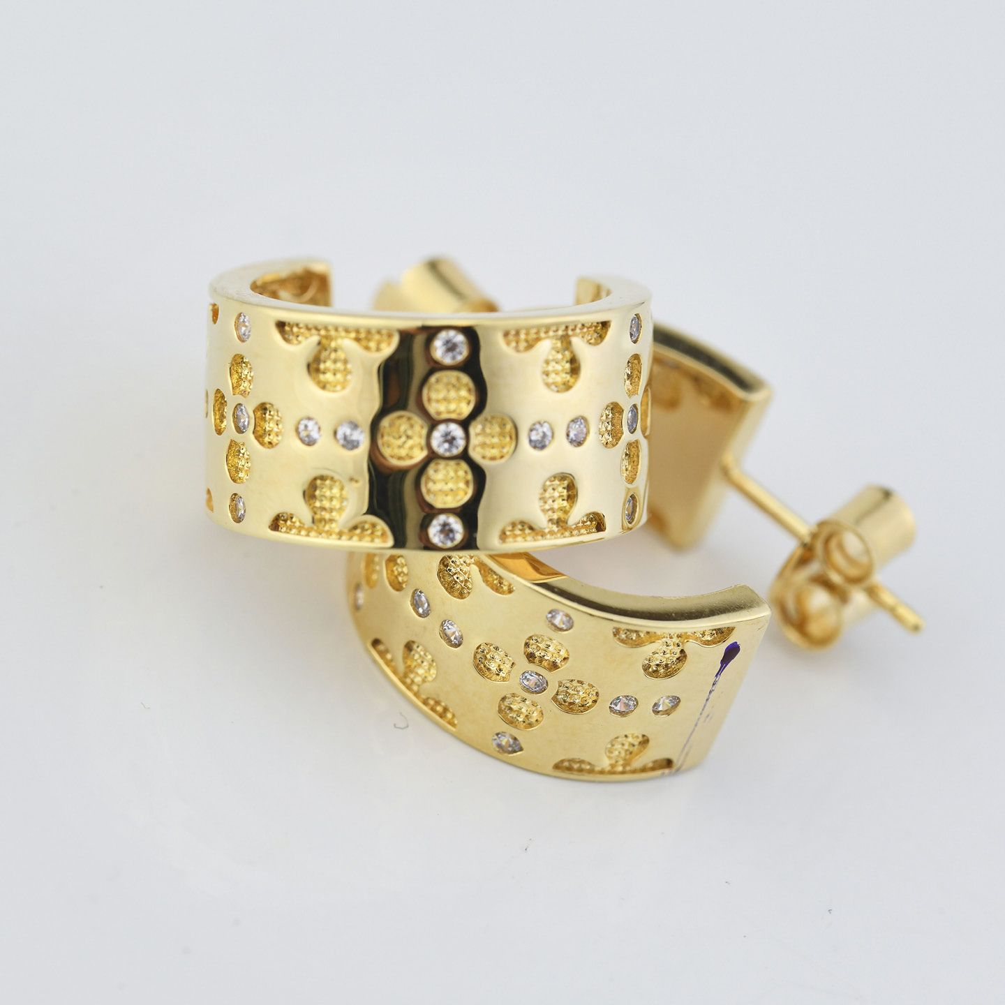 Orecchini placcati oro giallo a semicerchio con motivo floreale inciso e ripetuto lungo tutta la fascia con inserti di zirconi. Consegna entro 3gg lavorativi.