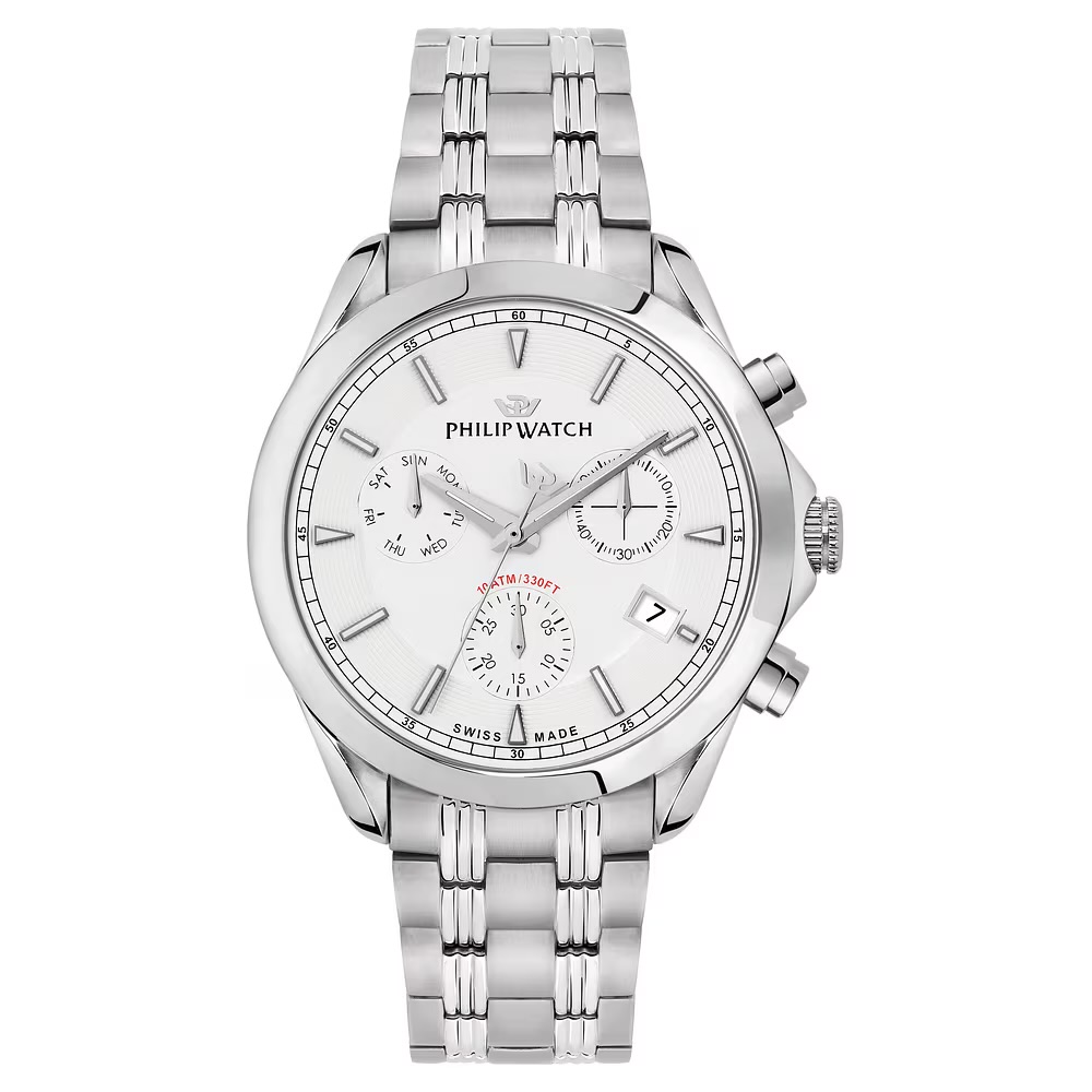 Orologio da uomo in Acciaio, Misura cassa: 41.00mm, Spessore cassa: 11.30mm,Vetro minerale,Chiusura Fibbia a farfalla, Movimento: Quarzo, Swiss made Water resistant: 10 atm, Garanzia: Ufficiale 2 anni Philip Watch, Confezione: Originale Philip Watch