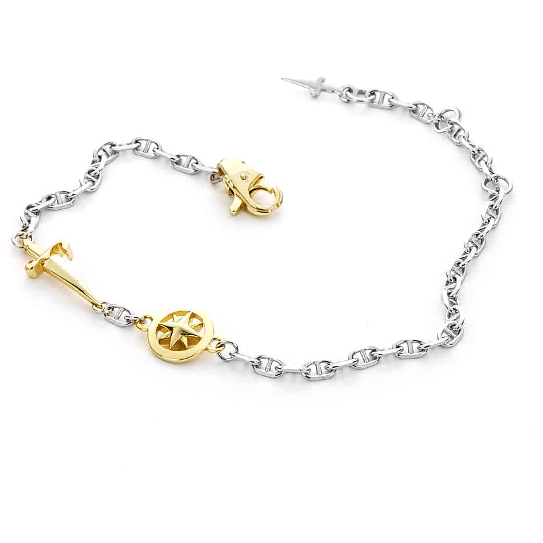 Bracciale da uomo di Cesare Paciotti. Il gioiello è realizzato in argento con rosa dei venti in argentoe finitura in rodio e oro. La lunghezza è di 18 cm + 3 cm di estensione con la chiusura a pappagallo. Consegna entro 3gg lavorativi. Spedizione gratuita.