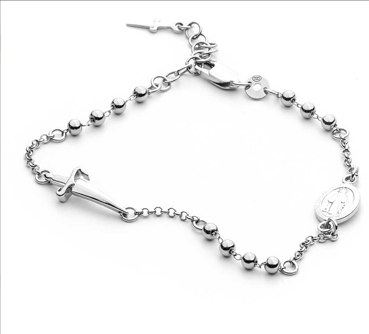 Bracciale da uomo di Cesare Paciotti. Bracciale rosario con pugnale e medaglietta sacra in argento di colore rodio. Misura: 18 cm + 3 di estensione. Gioiello con chiusura a pappagallo. Consegna entro 3gg lavorativi. Spedizione gratuita.