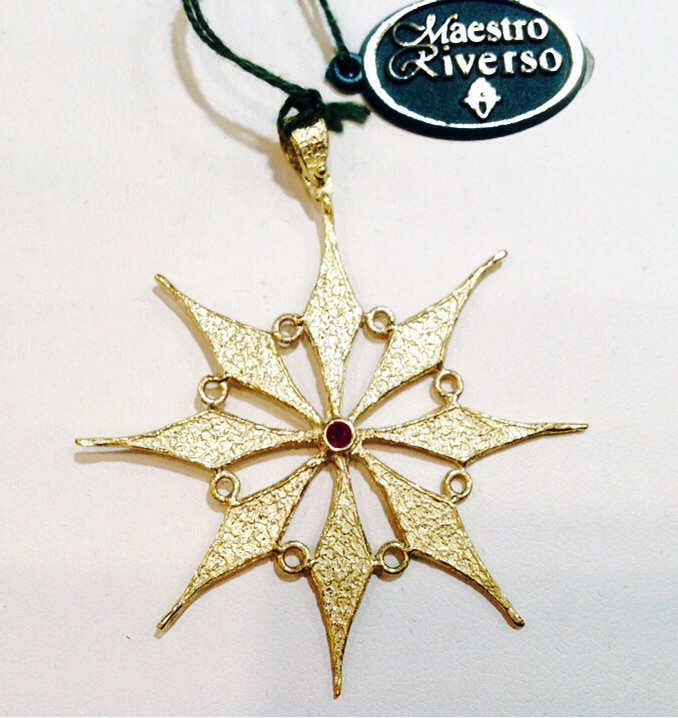 Collezione storica gioielli Maestro Riverso.Prodotto artigianale realizzato con la tecnica a cera persa,rifinita a mano da sapienti artigiani.Pendente in oro giallo 18kt modello Grimaldi con rubino originale. Dimensioni: lunghezza 6,1cm; larghezza 5,3.Consegna entro 3gg lavorativi. Spedizione assicurata e gratuita.