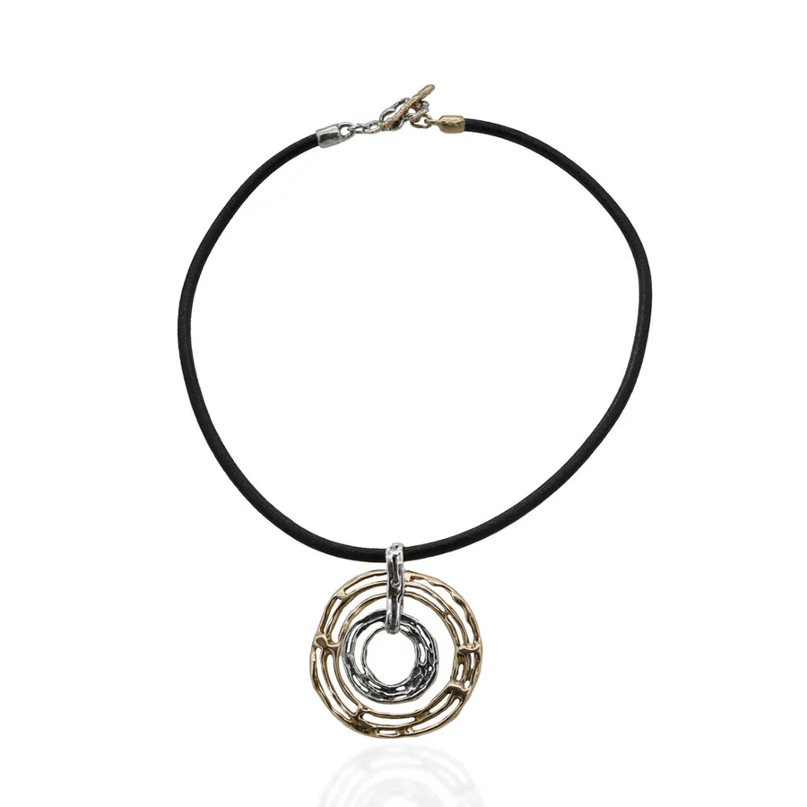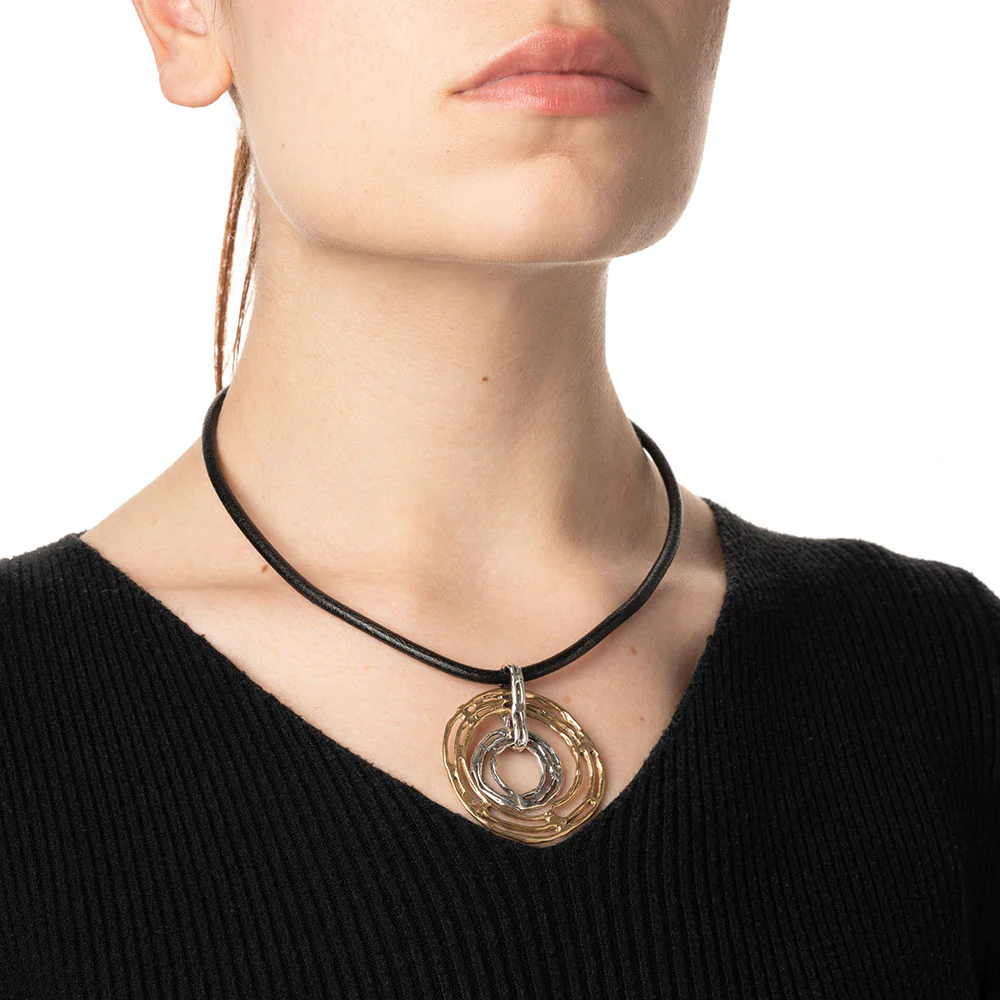Pendente con cerchi concentrici in argento e bronzo Cordino in vero cuoio nero/marrone. Chiusura artigianale T-BAR. Realizzato a mano in Italia. Consegna entro 3gg lavorativi.