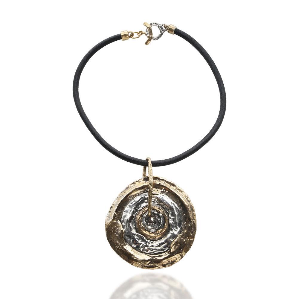 Pendette della collezione Sasso nello Stagno,è un gioiello contemporaneo unico, che cattura la magia del movimento naturale dell’acqua. Questo ciondolo, realizzato a mano in bronzo e argento, presenta un design scultoreo che richiama le onde concentriche create da un sasso che cade in uno stagno. Il pendente è sospeso su un elegante cordino in vero cuoio nero. Consegna entro 3gg lavorativi. Spedizione gratuita.