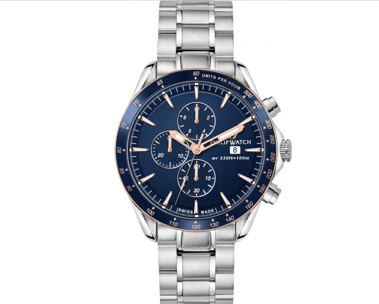 Nuova Collezione Blaze della Philip Watch. Cronografo al quarzo con cassa di diametro 44mm.Vetro,zaffiro antiriflesso,fondello e corona a vite,ghiera blu in alluminio,quadrante blu con dettagli oro rosa. Garanzia ufficiale 2 anni. Consegna entro 3gg. Spedizione gratuita