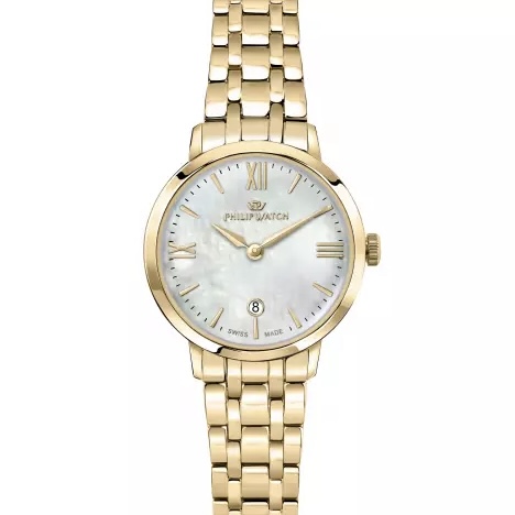 Collezione Audrey della Philip Watch, elegante orologio da donna placcato in oro con quadrante in madreperla,movimento al quarzo Swiss Made,vetro minerale,WR 10 ATM.Dimensione cassa 30mm. Garanzia ufficiale 2 anni. Consegna entro 3gg. Spedizione gratuita