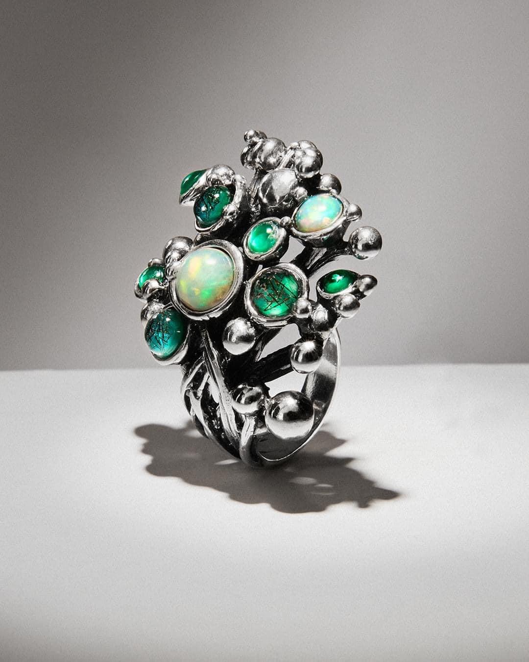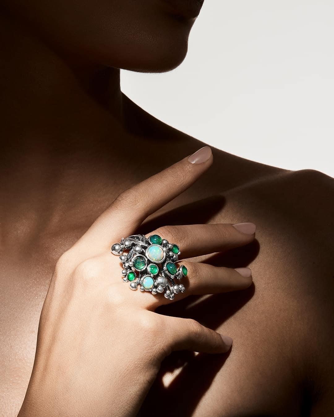 Nell’anello Bali Lushing Forest gli stilemi rotondeggianti in argento brunito, quasi a forma di goccia, richiamano, grazie al montaggio di nove pietre cabochon, la freschezza gioiosa dell’acqua e della pioggia tropicale. Misura regolabile dal n.14 al n.18.