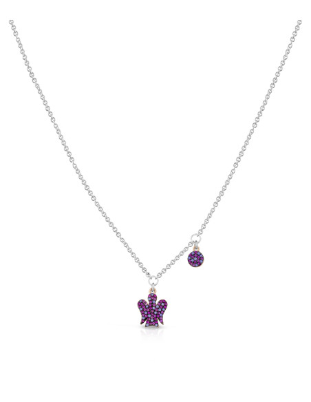 Collana in argento con angelo e zirconi fucsia. Lunghezza catena 40cm con estensione a 45 cm.