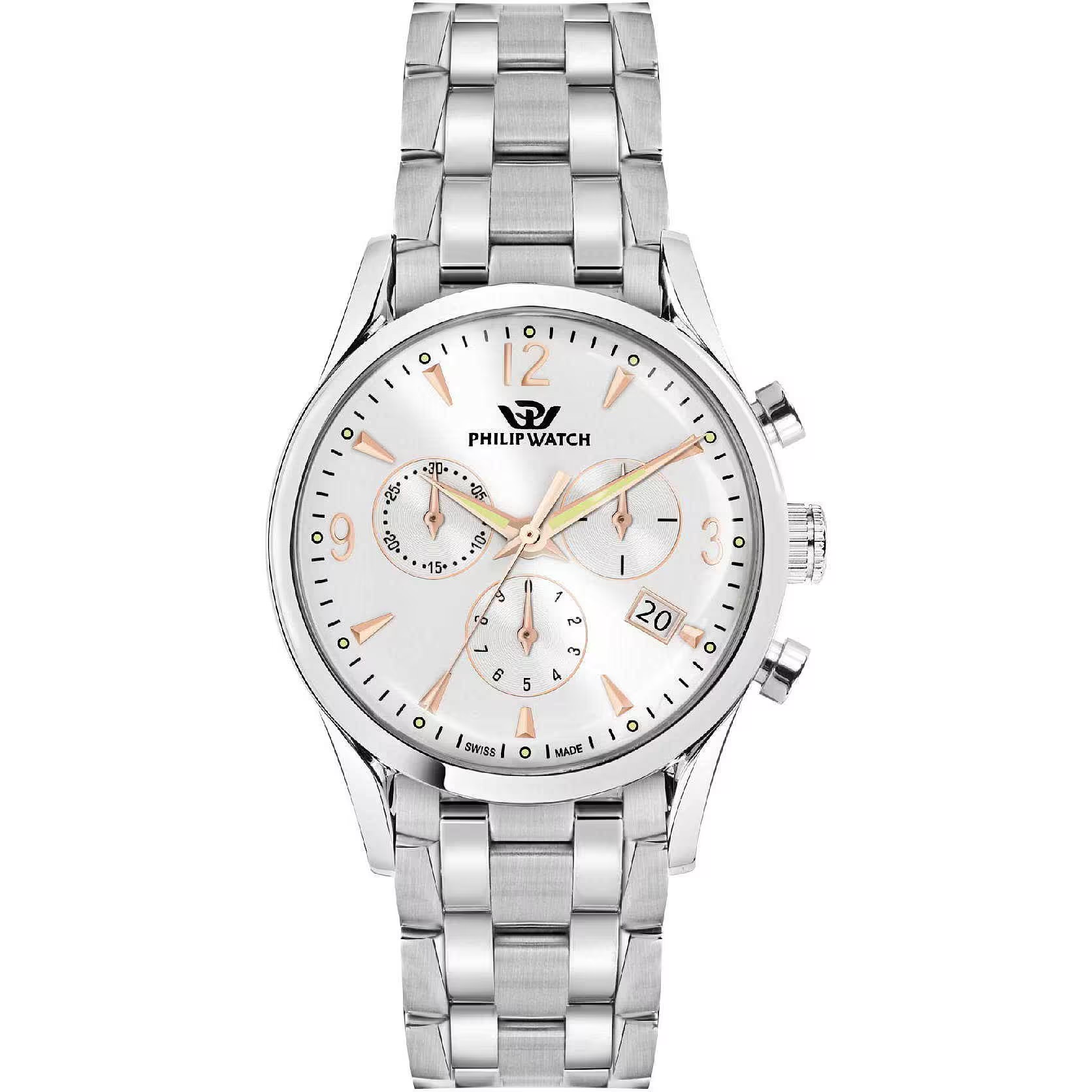 Orologio cronografo da uomo di Philip Watch della collezione sunray. Moodello con cassa in acciaio lucido del diametro di 39 mm e delle dimensioni di 49,2 x 39 mm. Il quadrante è di colore bianco sabbiato con vetro minerale e cinturino in acciaio di colore argento con chiusura con doppio bottone. Orologio con funzione datario e resistenza all’acqua di 3 atm.