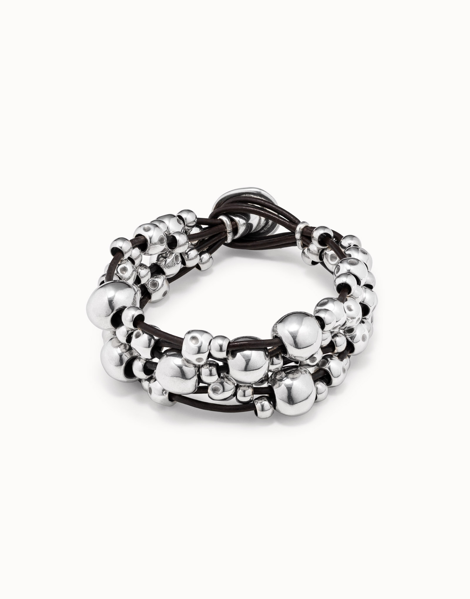 Bellissimo bracciale con tripla striscia di pelle marrone che unisce più pietre a forma di perla di diverse dimensioni bagnate nell’argento. Il gioiello e’ realizzato interamente a mano in Spagna. Consegna entro 3gg lavorativi. Spedizione gratuita.