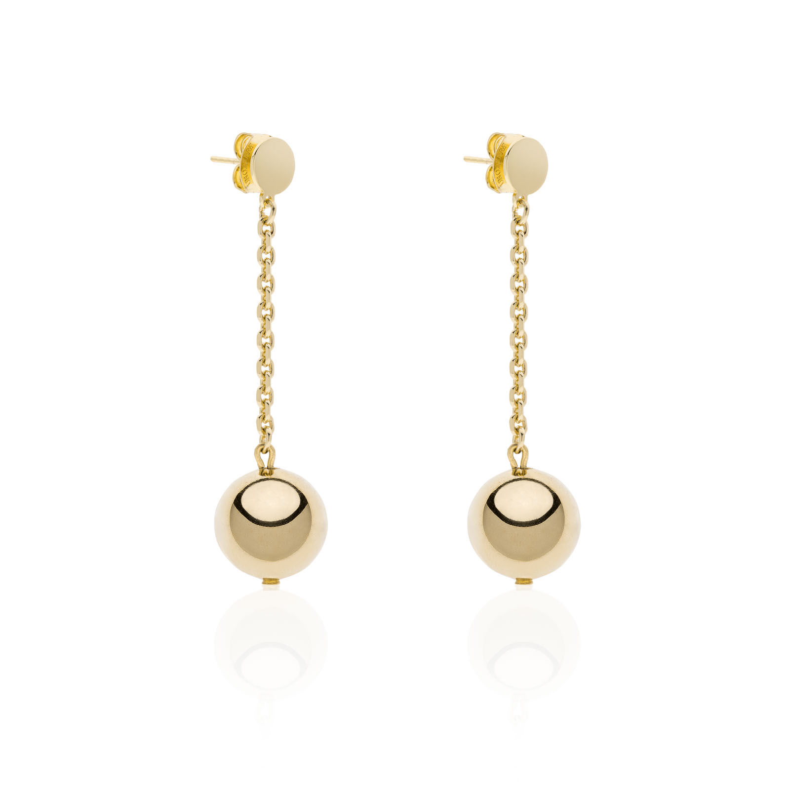 Orecchini lunghi in catena con pendente finale a sfera, bagno in oro o argento. Chiusura con perno e farfallina, lunghezza 6 cm. Consegna entro 3gg lavorativi.